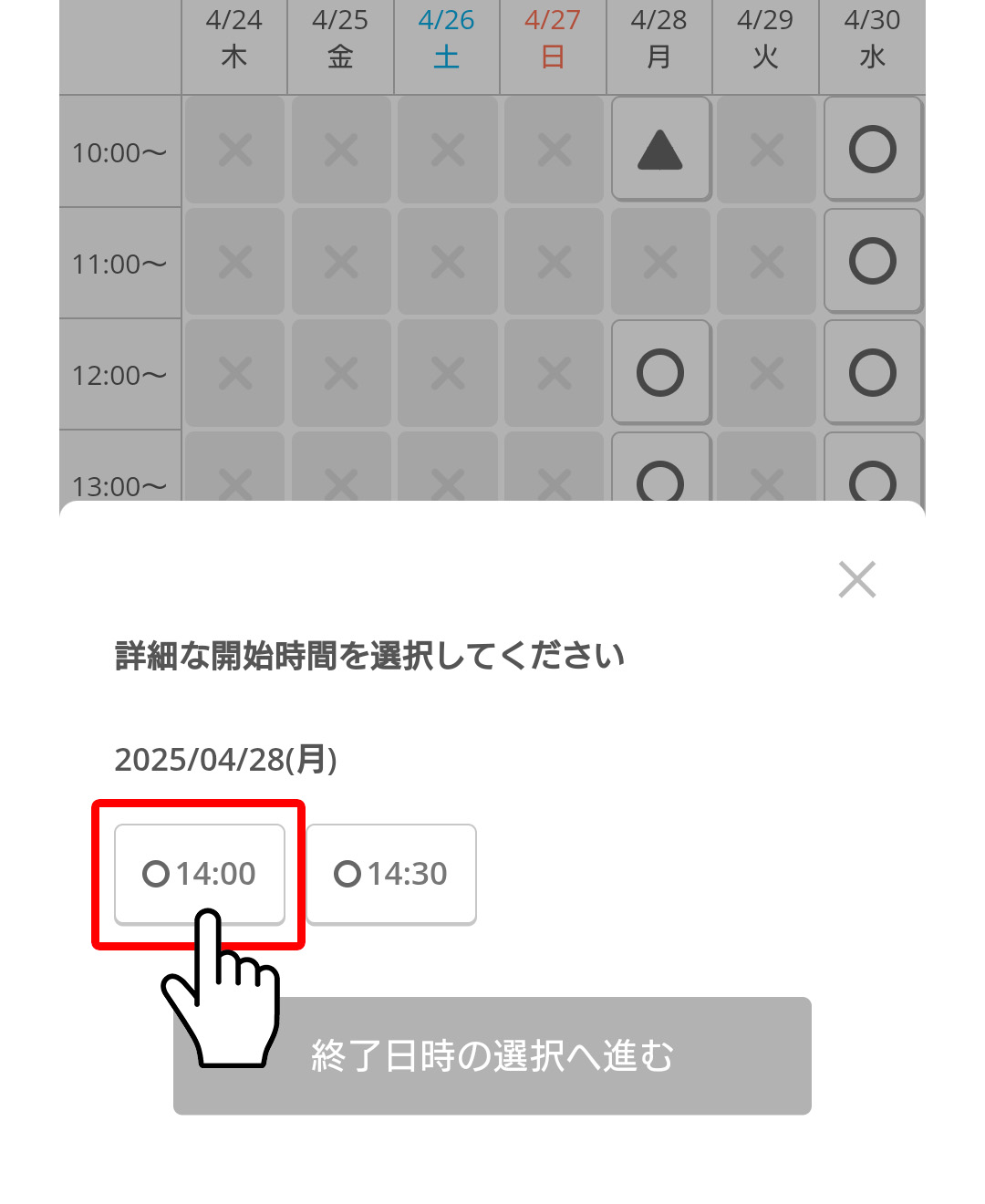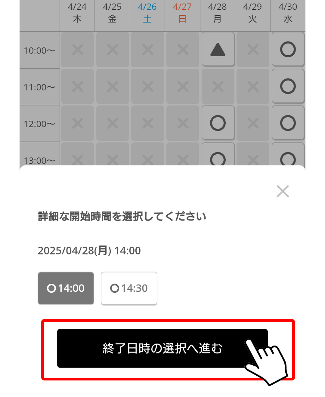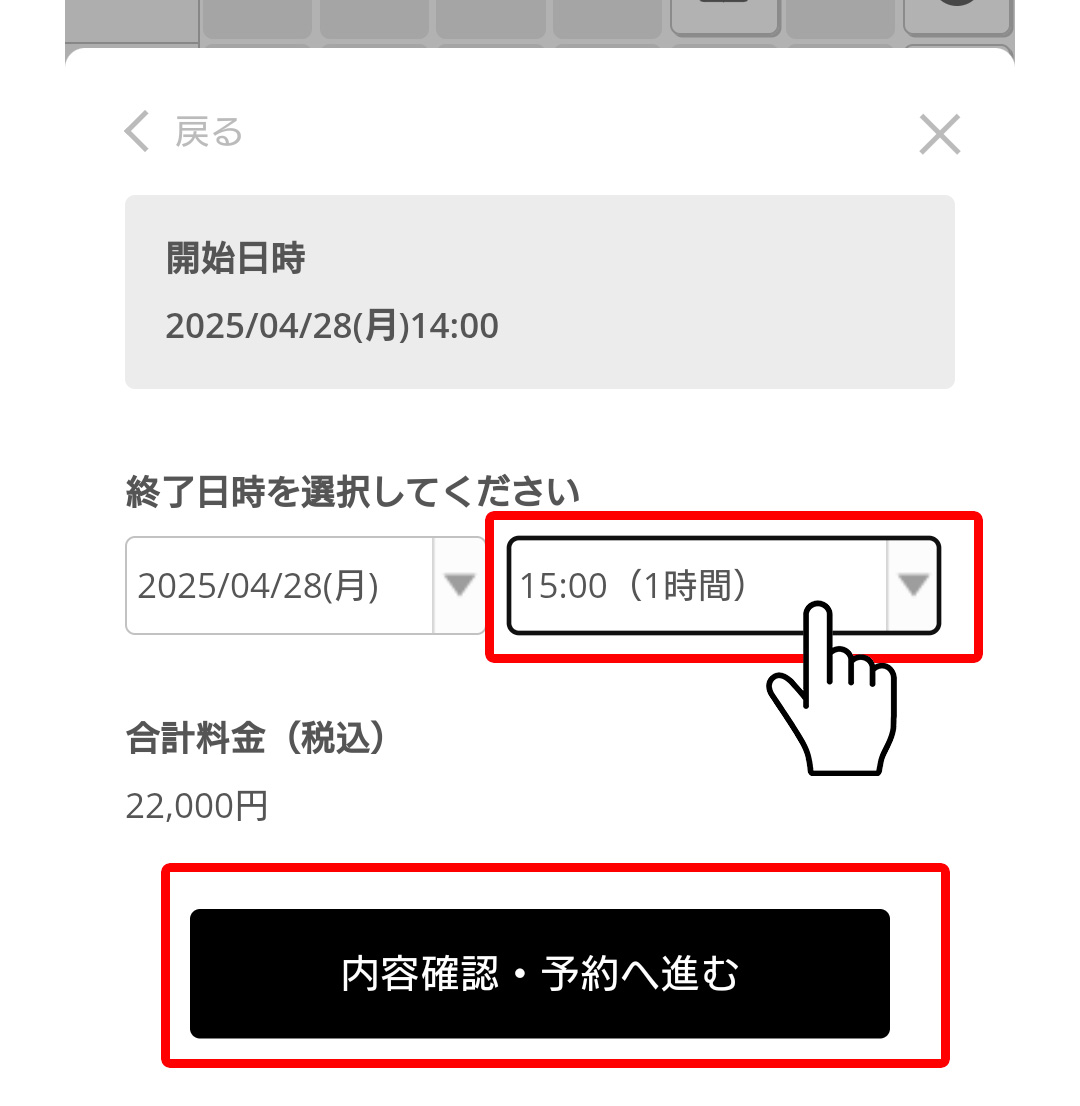 間違いなければ「終了日時の選択へ進む」をタップしてください。