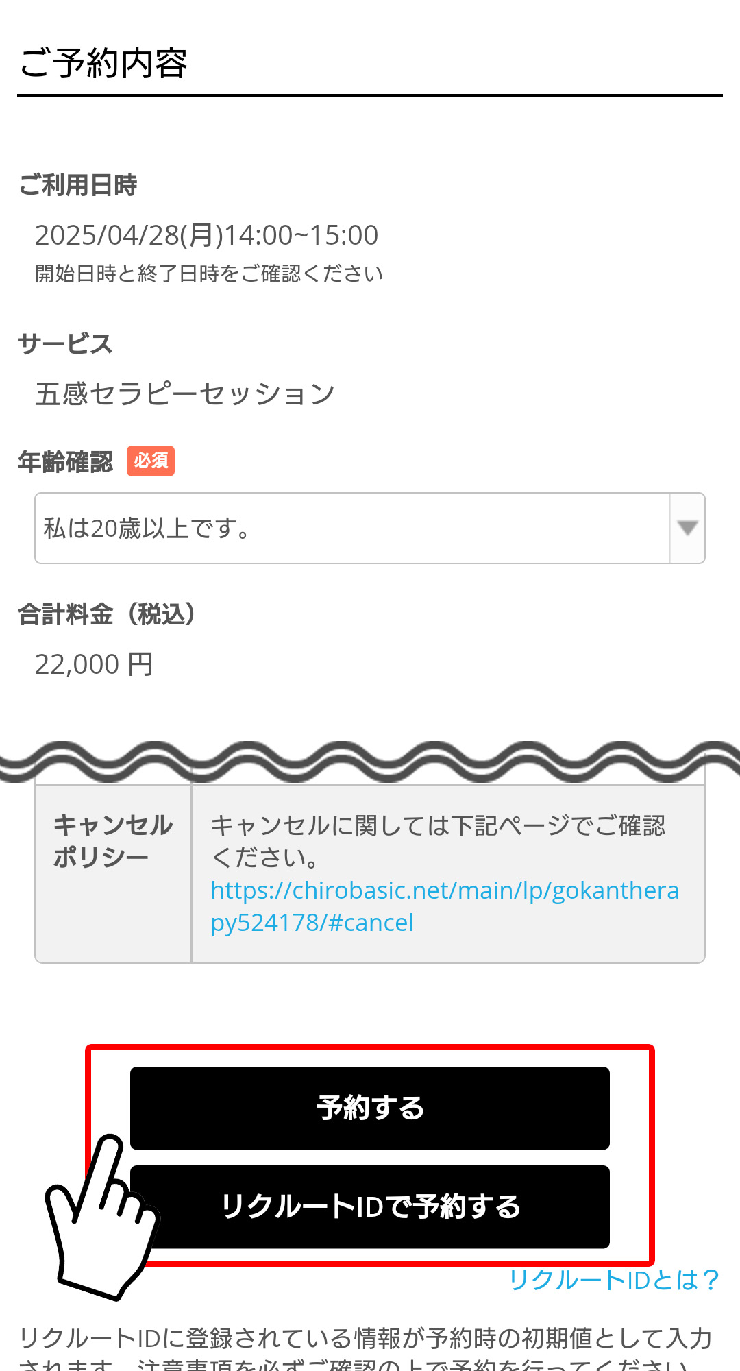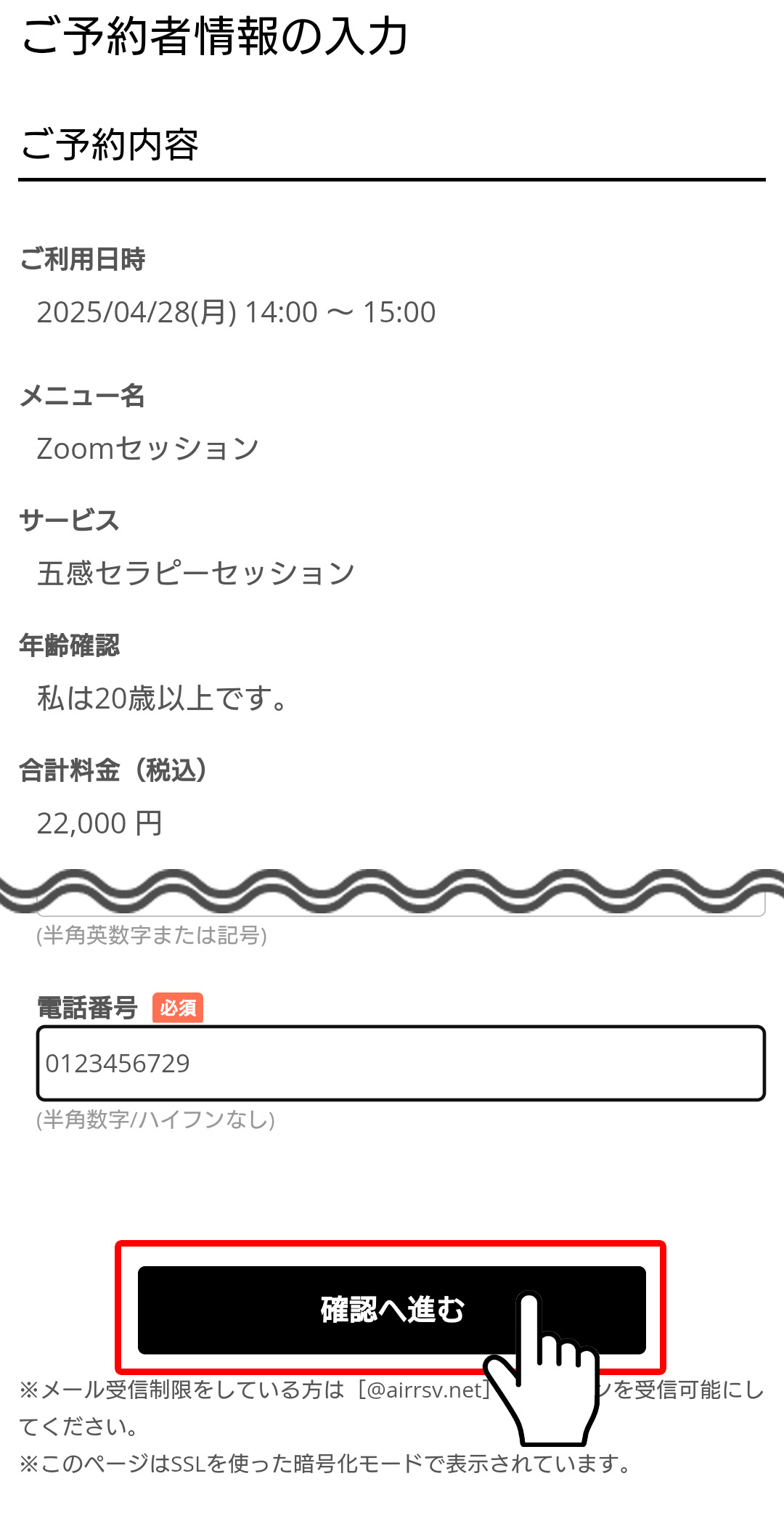 「上記に同意して予約を確定する」ボタンをクリックして下さい。